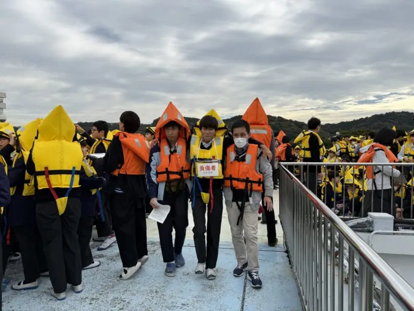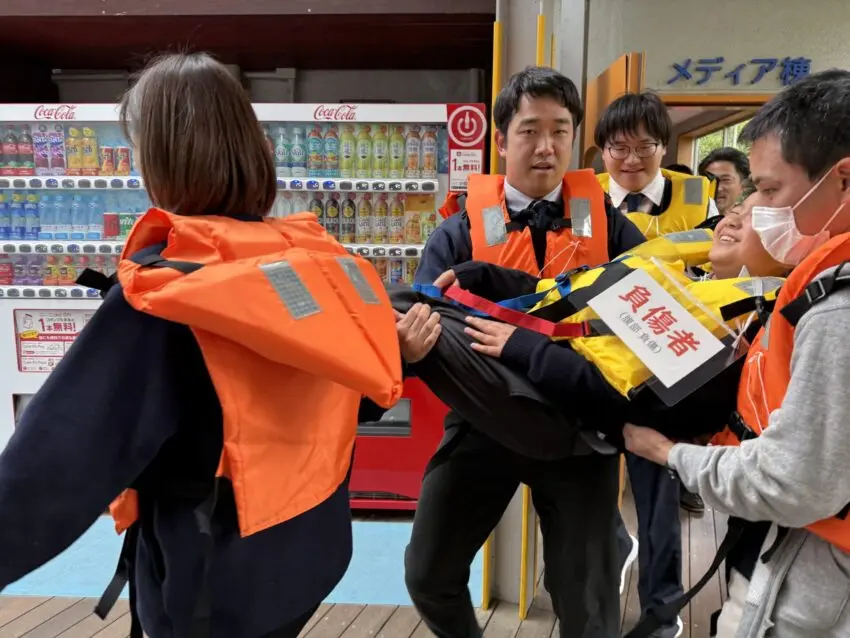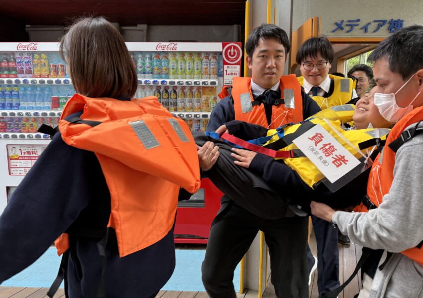 また、負傷者が出る想定でも訓練が行われ、腹部を負傷した生徒は職員に抱えられて、脚を負傷した生徒には肩を貸して避難するなど、協力しながらの避難が見られました。
