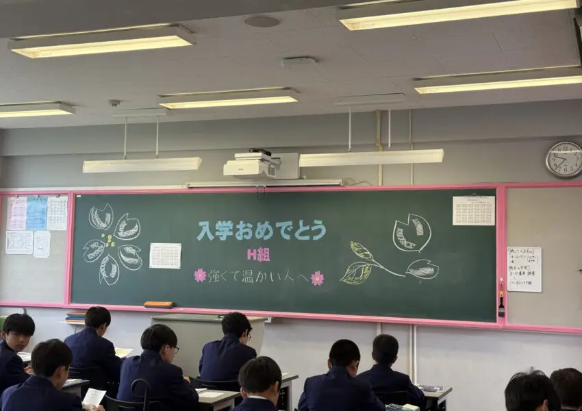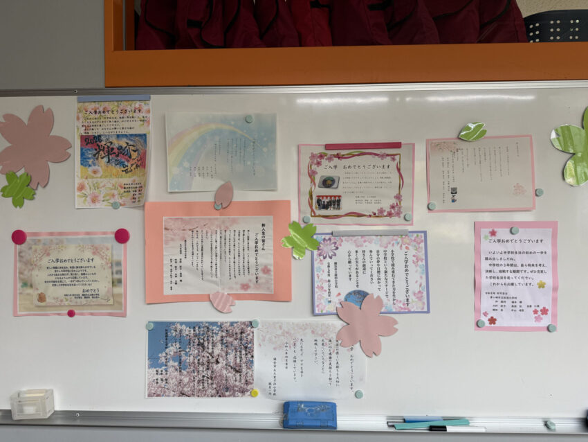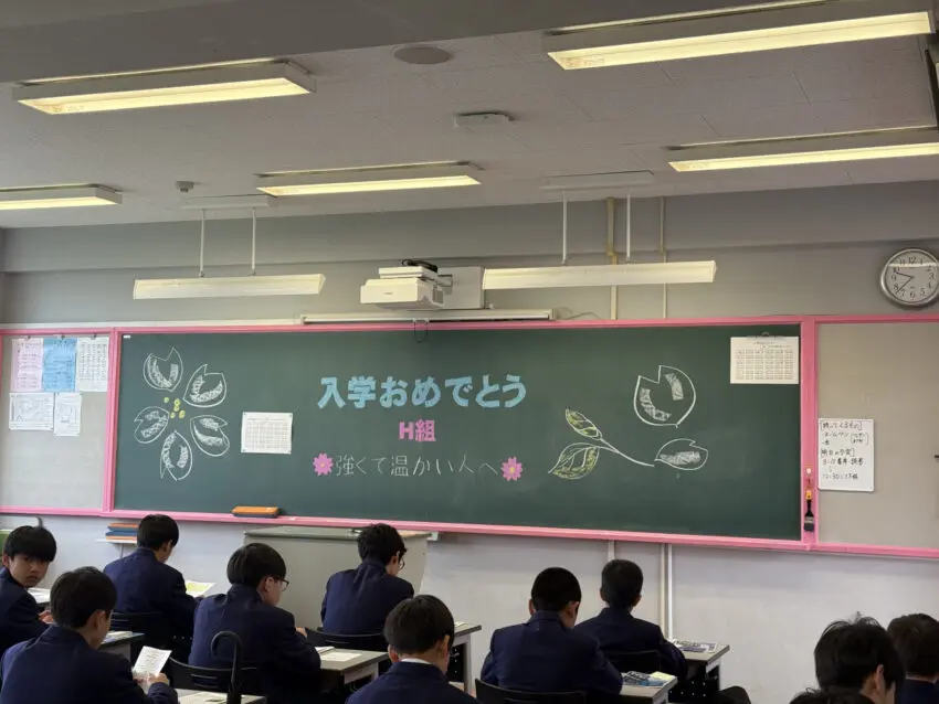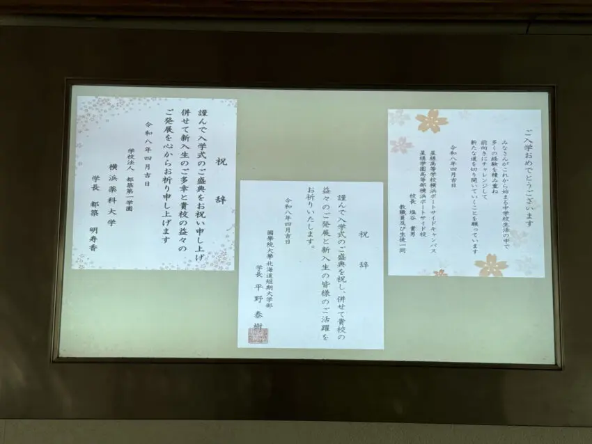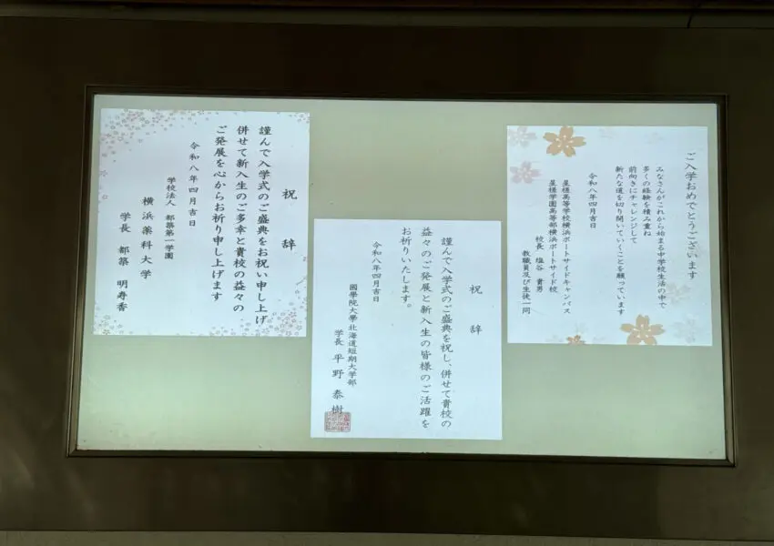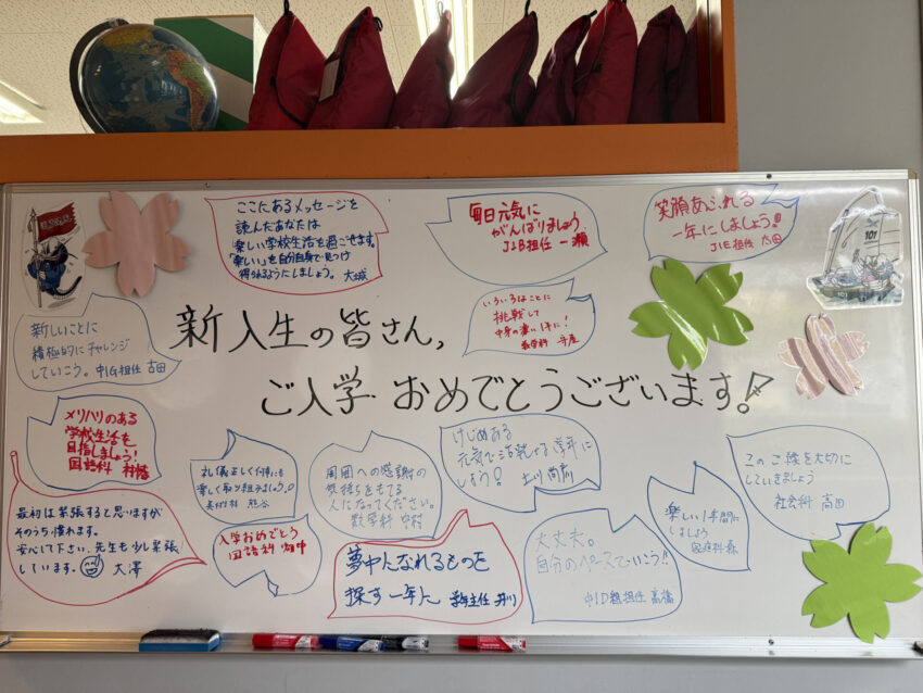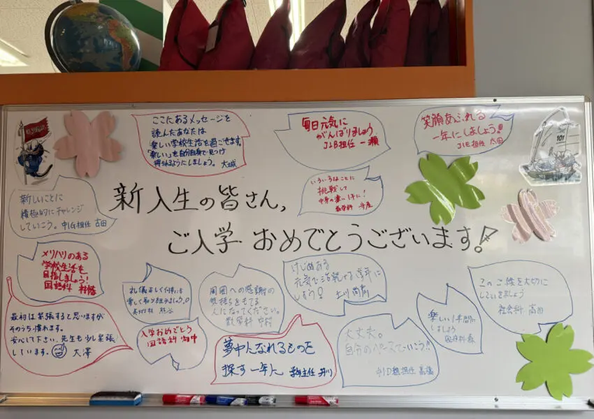 職員室前のホワイトボード、デジタルサイネージ、黒板など、校舎のいたるところに新入生を歓迎するメッセージがありました。