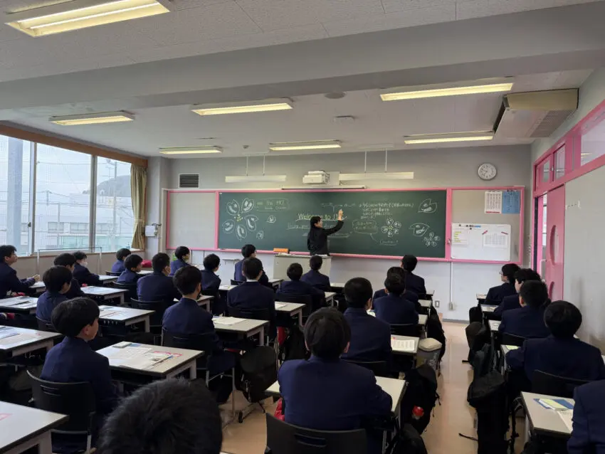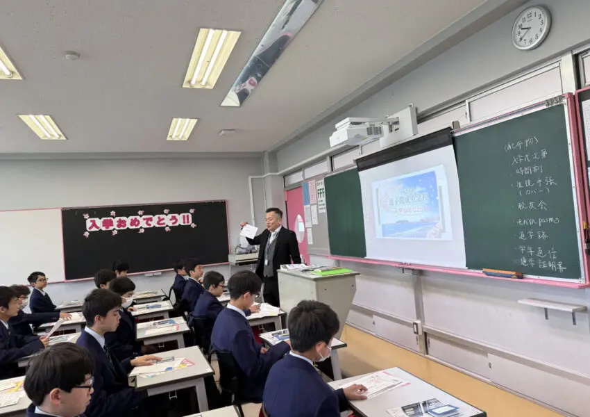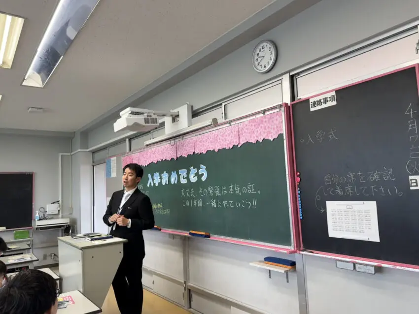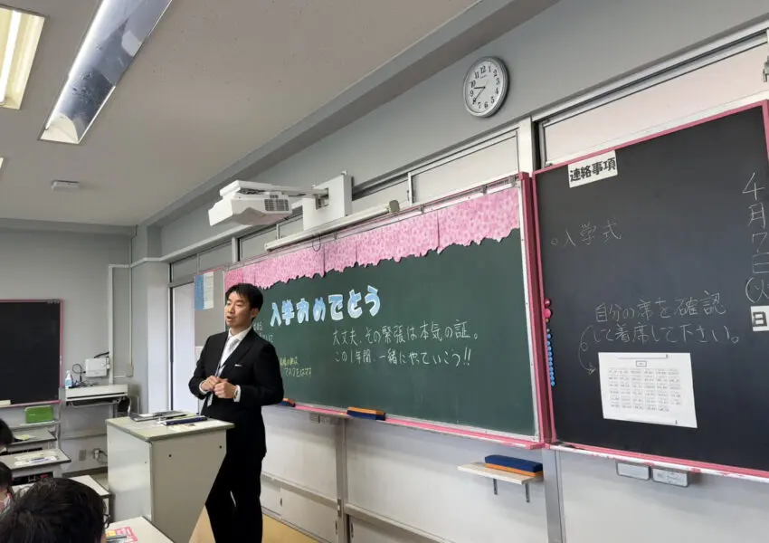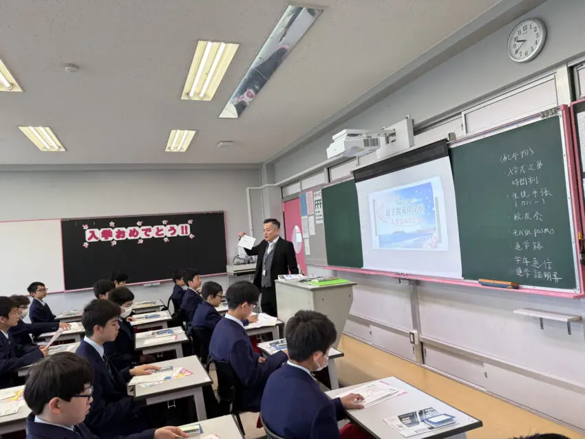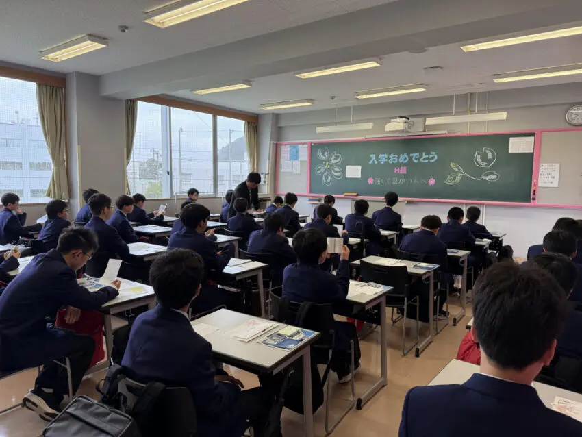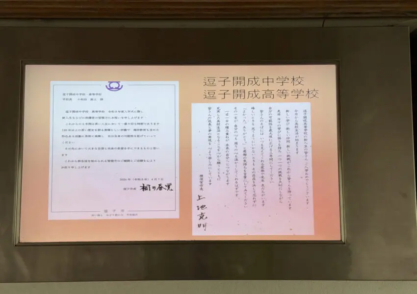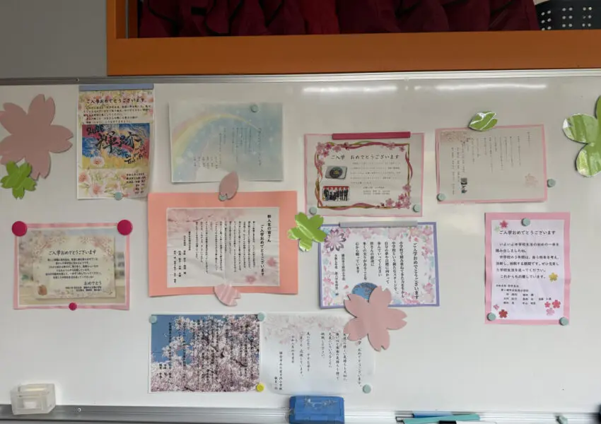職員室前のホワイトボード、デジタルサイネージ、黒板など、校舎のいたるところに新入生を歓迎するメッセージがありました。