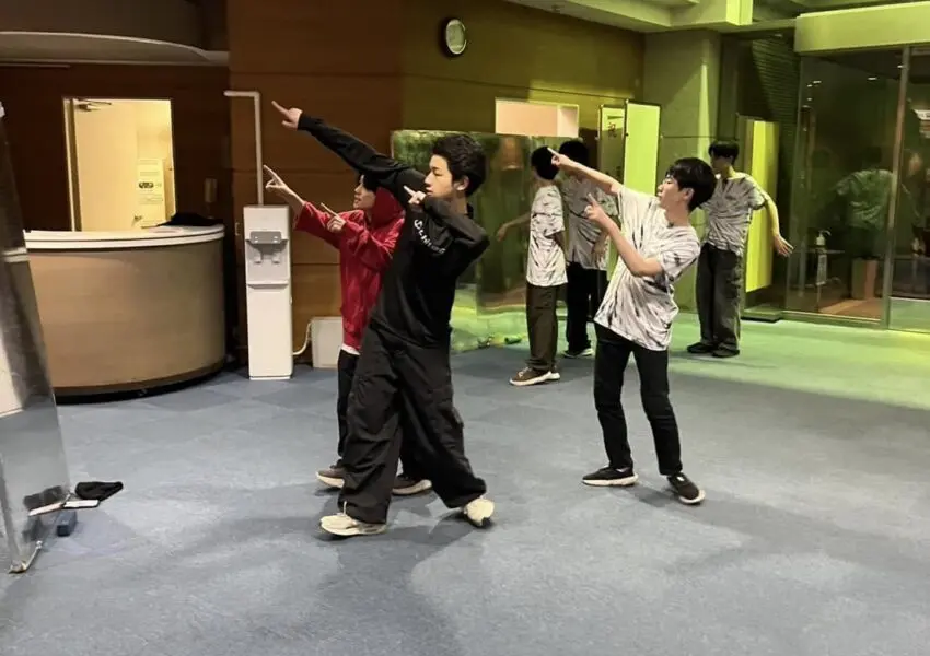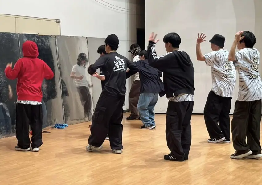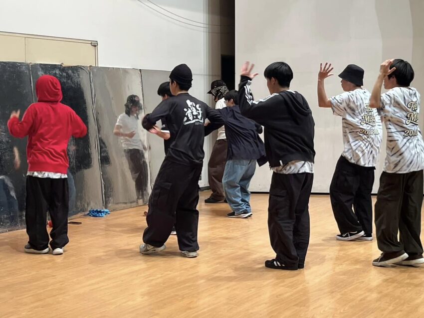 写真は校内合宿中の卓球部とダンス部のみんなです。