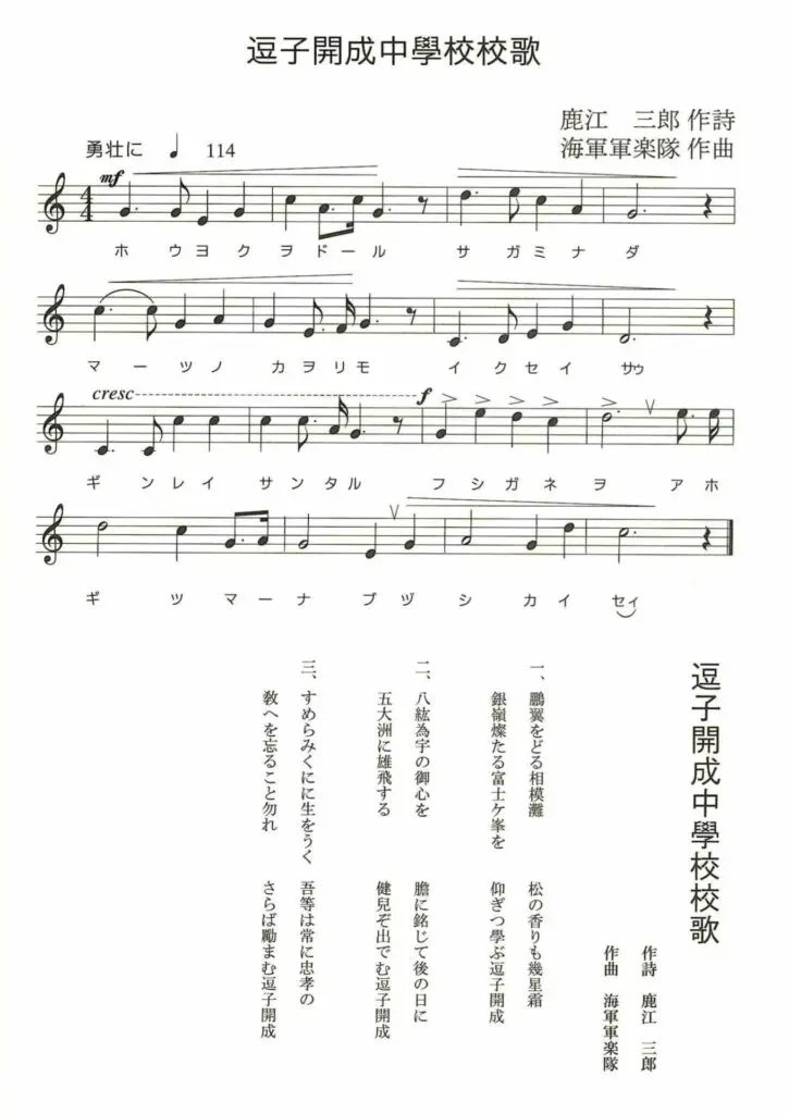 校歌制定から19年後の昭和18(1943)年、創立40周年を機に新しい校歌が制定されました。作詞は校長鹿江三郎、作曲は海軍軍楽長内藤清五でした。これまで公にされた楽譜などでは作曲は「海軍軍楽隊」と記されています。歌詞には時勢を反映して「八紘為宇の御心を 膽に銘じて後の日に」、「すめらみくにに生をうく 吾等は常に忠孝の教へを忘ること勿れ」などの句が含まれていたことから、この校歌は太平洋戦争後に廃止され、元の校歌「天地分くる富士ヶ嶺の 裾にひろごる秋津島」が再び歌われるようになり、今日に至っています。
