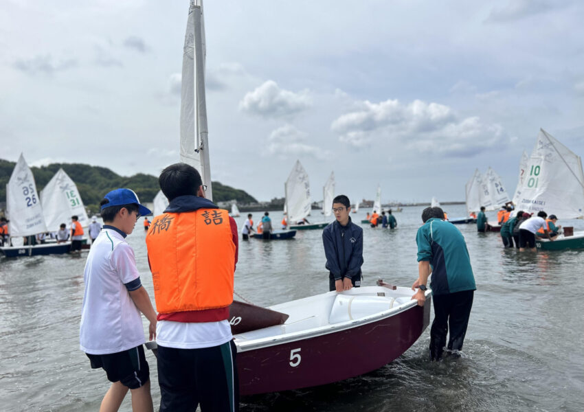 生徒全員が教室へと戻った後、海ではヨット部が最後の片付けをしていました。 -