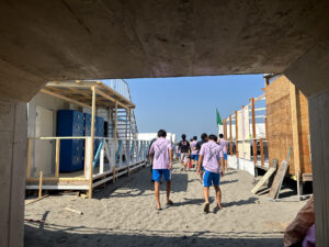 遠泳を終えた第1団、砂を落としてシャワー室へ。