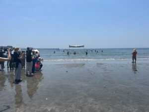 ライフセーバーの方々と周りを泳ぐ水泳部たちがみんなの安全を守ります。