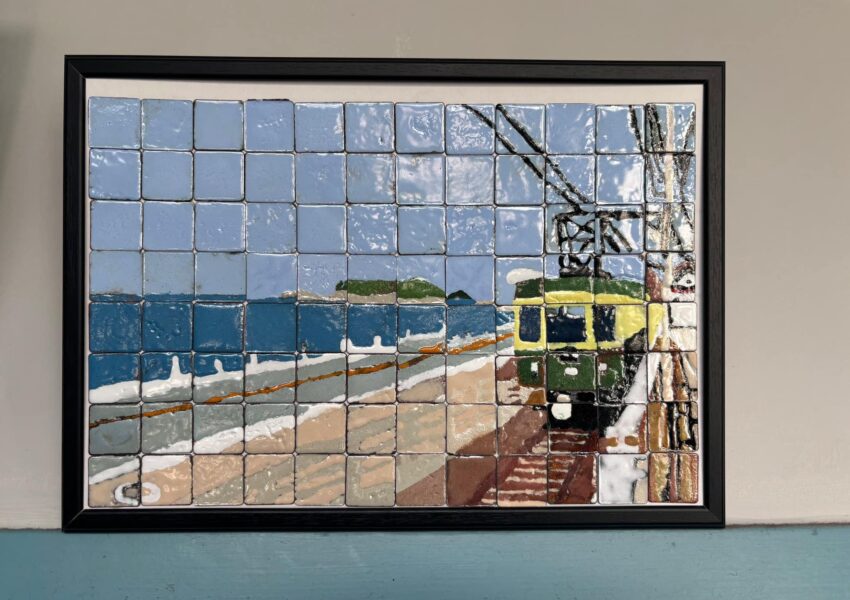 今回の作品は、江の島と湘南の海をバックに,江ノ電が走っている情景を七宝焼で表現しました。